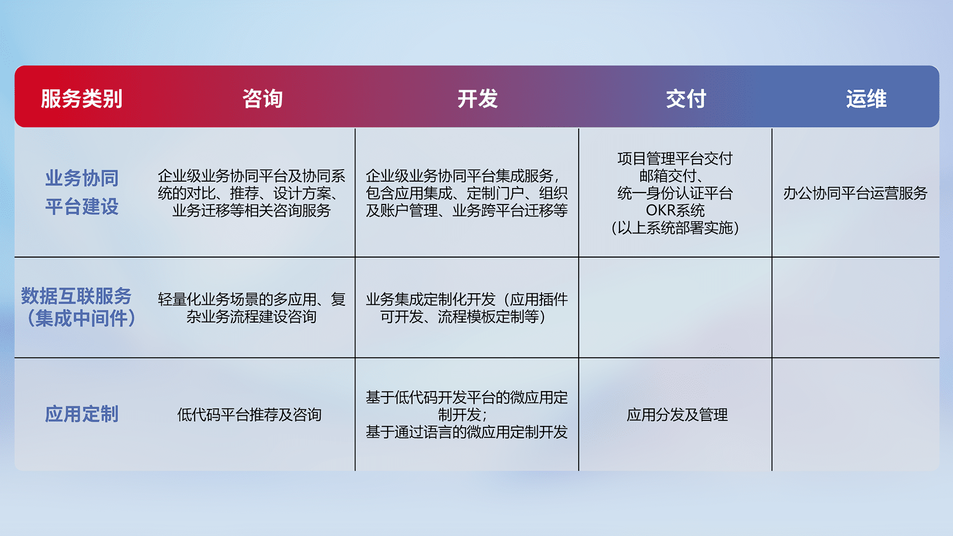 针对钉钉、、、企微、、IDaas等平台级产品提供产品的规划、、、、方案、、交付、、、定制化开发等服务,,实现如统一协同办公、、、、智能客户服务、、、、混合会议管理、、智能数据查询、、、、等业务场景,,实现数字化转型。。